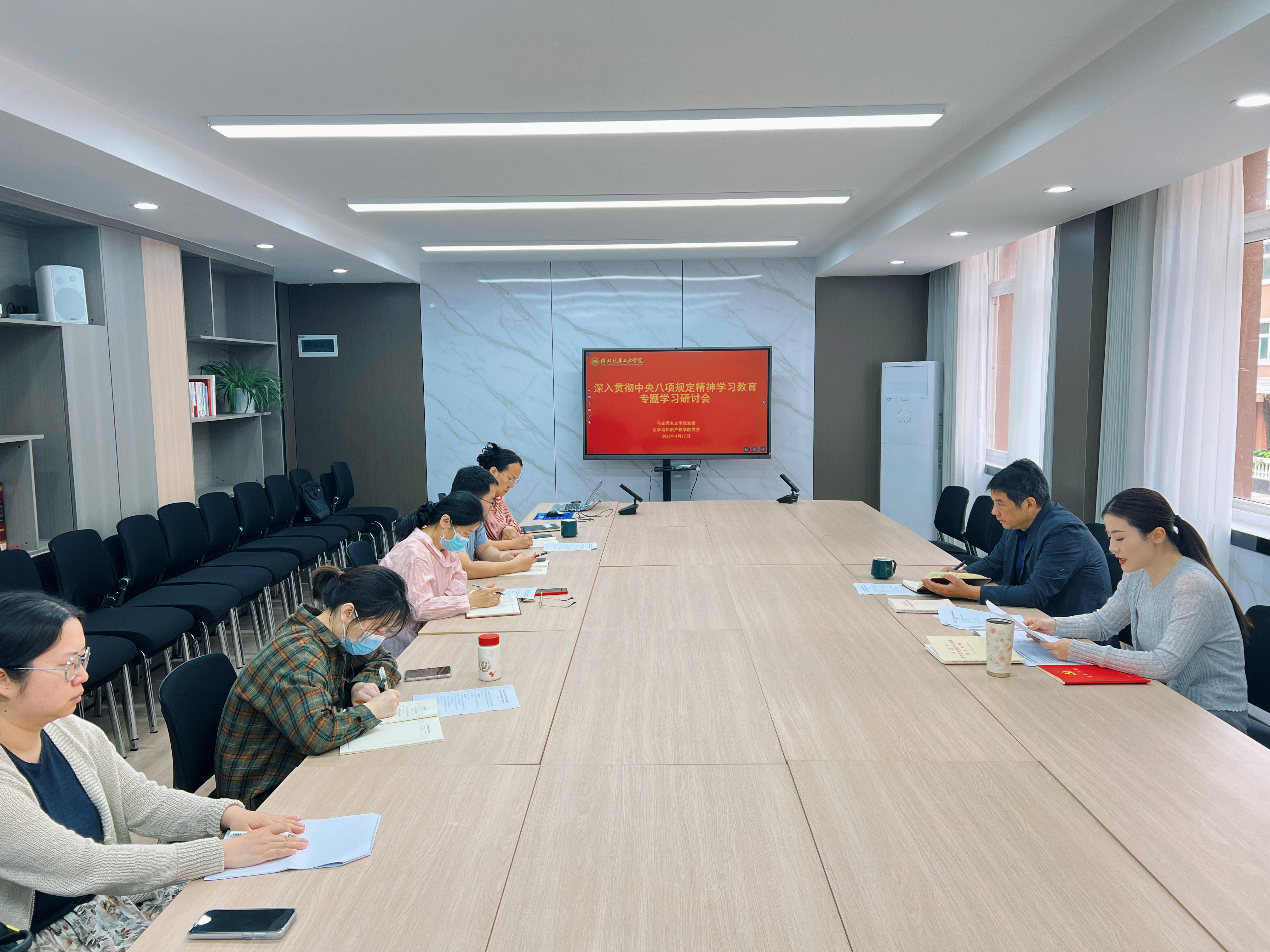 为积极响应校组织部学习教育工作提示相关要求,扎实推进学院党委深入贯彻中央八项规定精神学习教育计划,4 月 17 日上午,Beat365官方网站党委、法学与知识产权学院党委在学院 3206 会议室举办了专题学习研讨会。学院党委委员、各支部书记参会,会议由副书记李童主持。