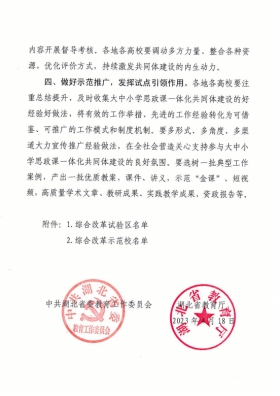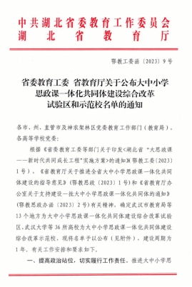 根据《省委教育工委等部门关于印发<湖北省“大思政课——新时代共同成长工程”实施方案>的通知》(鄂教工委[2023]1号)、《省教育厅关于推进全省大中小学思政课一体化共同体建设的指导意见》(鄂教思政[2023]1号)和《省教育厅办公室关于支持建设一批大中小学思政课一体化共同体的通知》(鄂教思政办函〔2023)2号)有关精神,湖北省委教育工委、省教育厅确定武汉市教育局等13个地方为大中小学思政课一体化共同体建设综合改革试验区,Beat365官方网站等36所高校为大中小学思政课一体化共同体建设综合改革示范校,建设周期为1年。